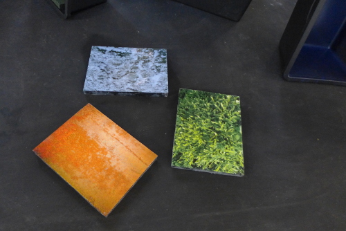 Die Bildhauerin hat aus Stahl neun Objekte geformt, die wie zufällig auf dem Grün verteilt sind. Sie scheinen in unterschiedliche Richtungen wegzusacken. Jeder “Karton” steht für sich allein. Die geöffneten Deckel schaffen jedoch eine Verbindung der Objekte zueinander, als träten sie in Kommunikation.Außerdem geben die Öffnungen Einblicke in das rotglänzende Innere. Die Künstlerin spielt mit dem Dualismus von Hart und Weich, von Starrheit und Formbarkeit: Die rostige Oberfläche der Schachteln verleiht ihnen eine weiche Farbigkeit, die mit der haptischen Erfahrung nicht übereinstimmt. Die Skulpturen haben keinen rechten Winkel, vermitteln aber den Eindruck, als seien sie ehemals geometrisch klare Figuren gewesen und hier nur etwas aus der Form gegangen. Wie Pappkartons, die feucht geworden sind, scheint man sie zerknautschen zu können. Doch auch hier täuscht der Augenschein. Es sind Stahlobjekte. Leicht verformbar sind sie also nicht.