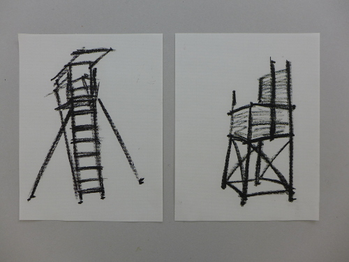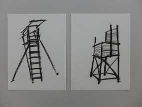 Mehrere Gegenstände bilden ein Ensemble, scheinbar zufällig in den Raum gestellt. Leuchtend blaue “Leitersitze” oder “Sitzleitern”, Mischwesen aus Leitern und Sitzen, haben sich zueinandergesellt. Dem zunächst auftretenden Gedanken an Jägersitze oder die Hochsitze der Bademeister in Schwimmbädern widerspricht die Platzierung der Sitzplatten. Die Leitern scheinen selbst darauf zu sitzen. Auf den ersten Blick wirken die Objektgruppen von Helga Kellerer freundlich und ansprechend, man glaubt Bekanntes aus dem alltäglichen Leben vorzufinden.