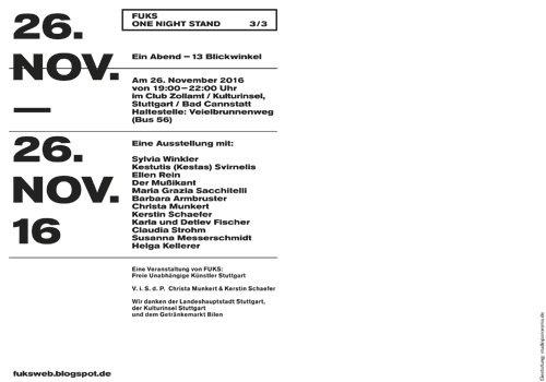 aus dem Kreis des Künstlerkollektivs FUKS, Freie Unabhängige Künstler Stuttgart, stellen am Samstag, dem 26. November 2016, in einer performativen Ausstellung im Club Zollamt aktuelle Arbeiten und Positionen vor.